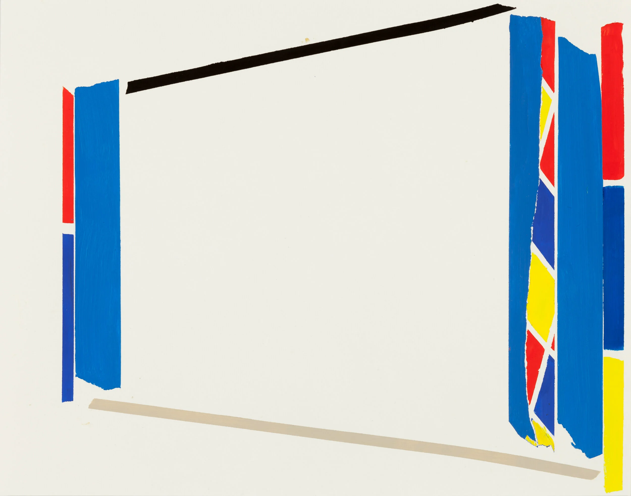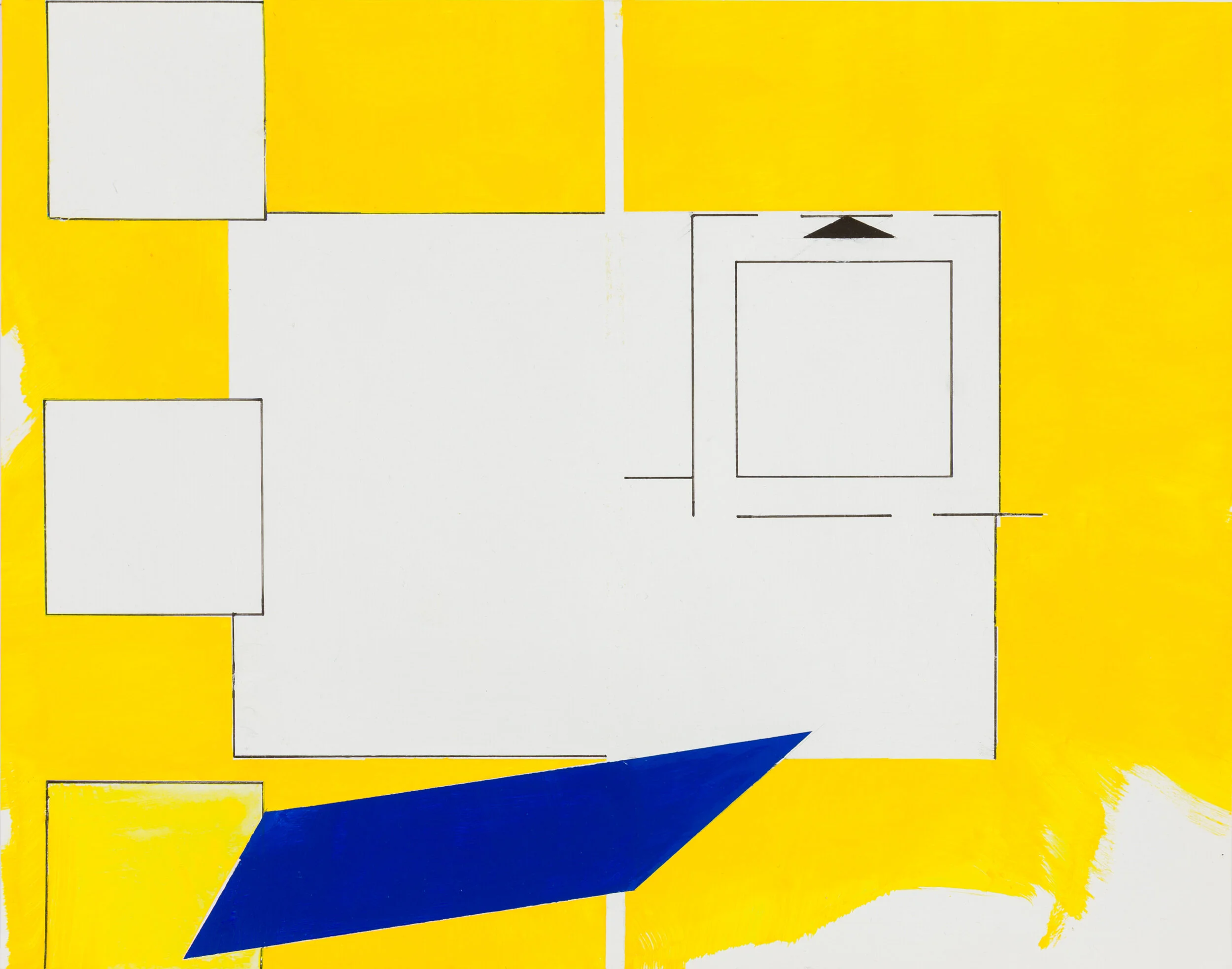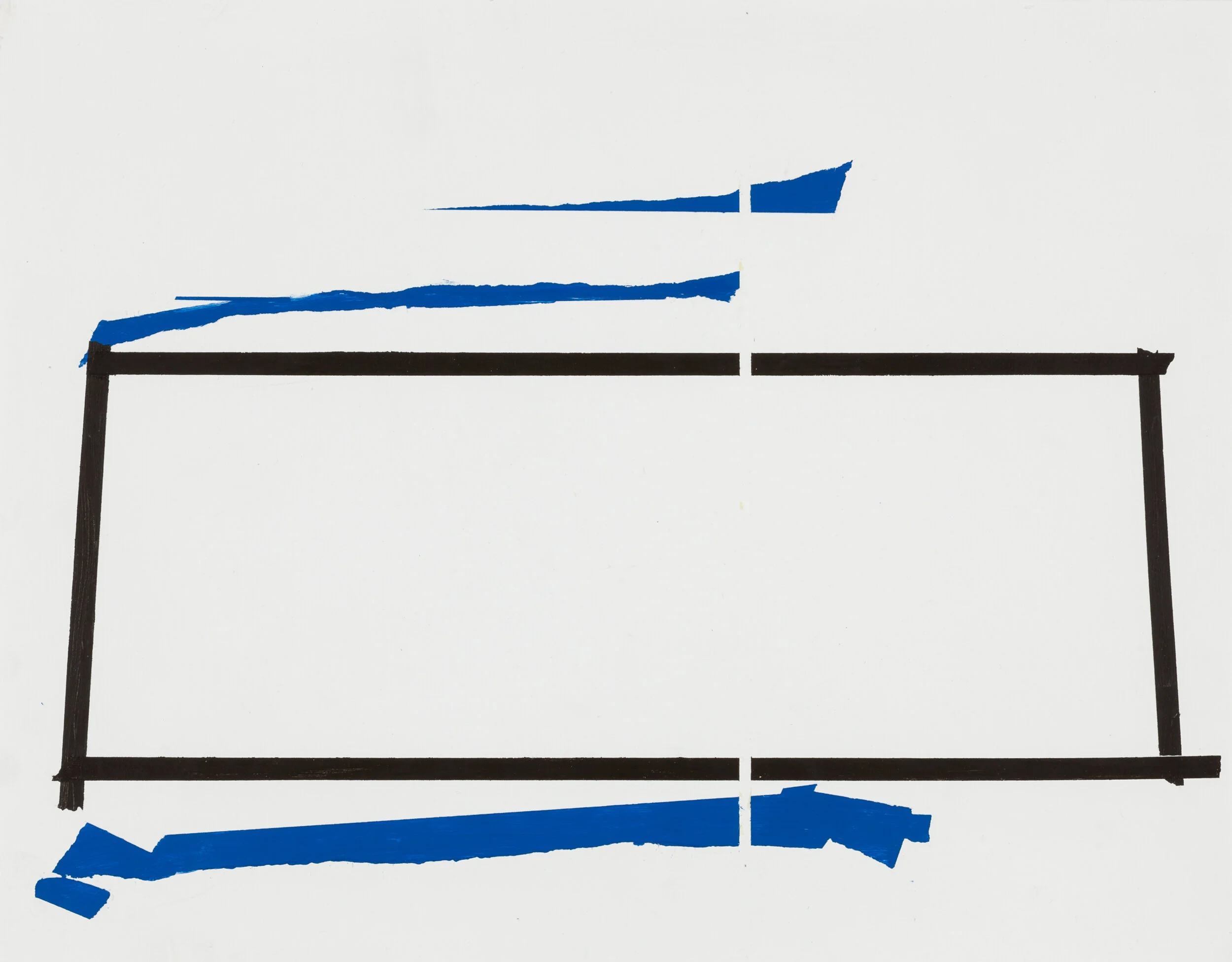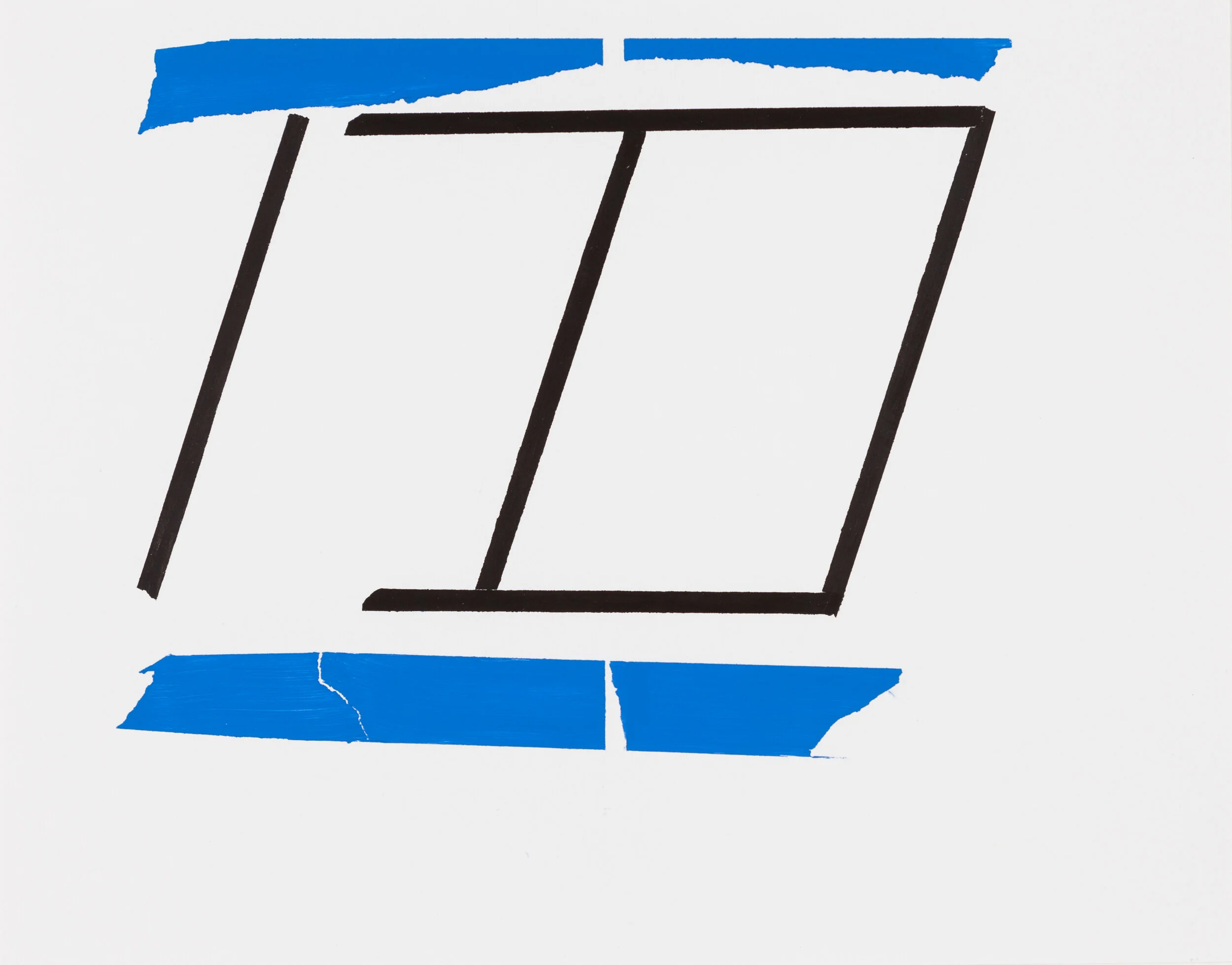 The frame is a complex topic, a term with palpable reference to contexts where interpretive potentiality proliferates. Here the frame articulates a shifting set of relative relations: what is built or painted above, upon, below; left or right of a center; within, without. As a figure, edge, or field of its own, line is constructed: simulated as tape through using acrylic to imitate masking tape on panels. The frame is also more: here it is a diagram of potential conceptual frames, mental structures.