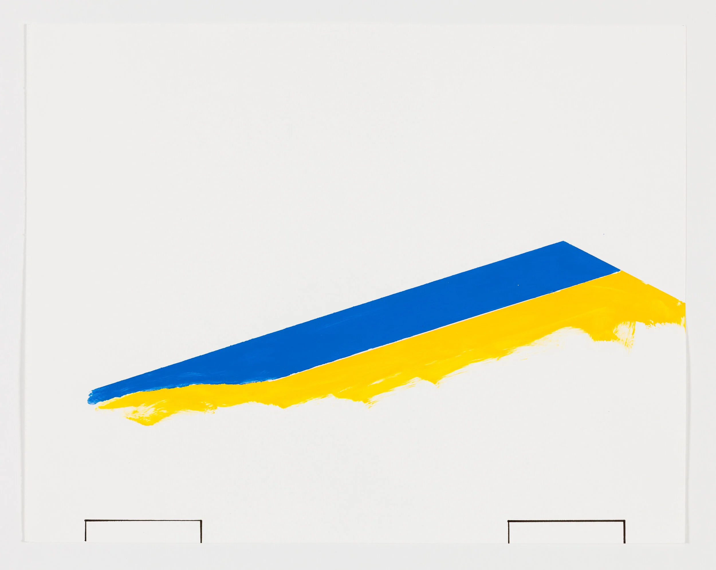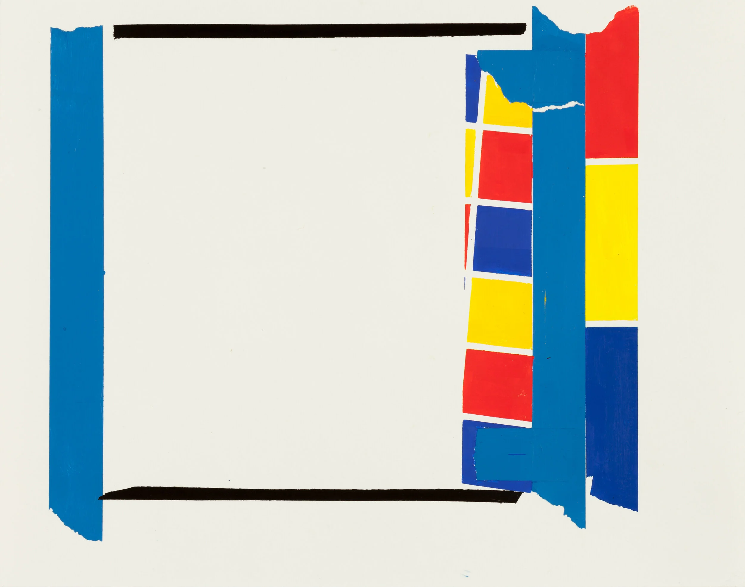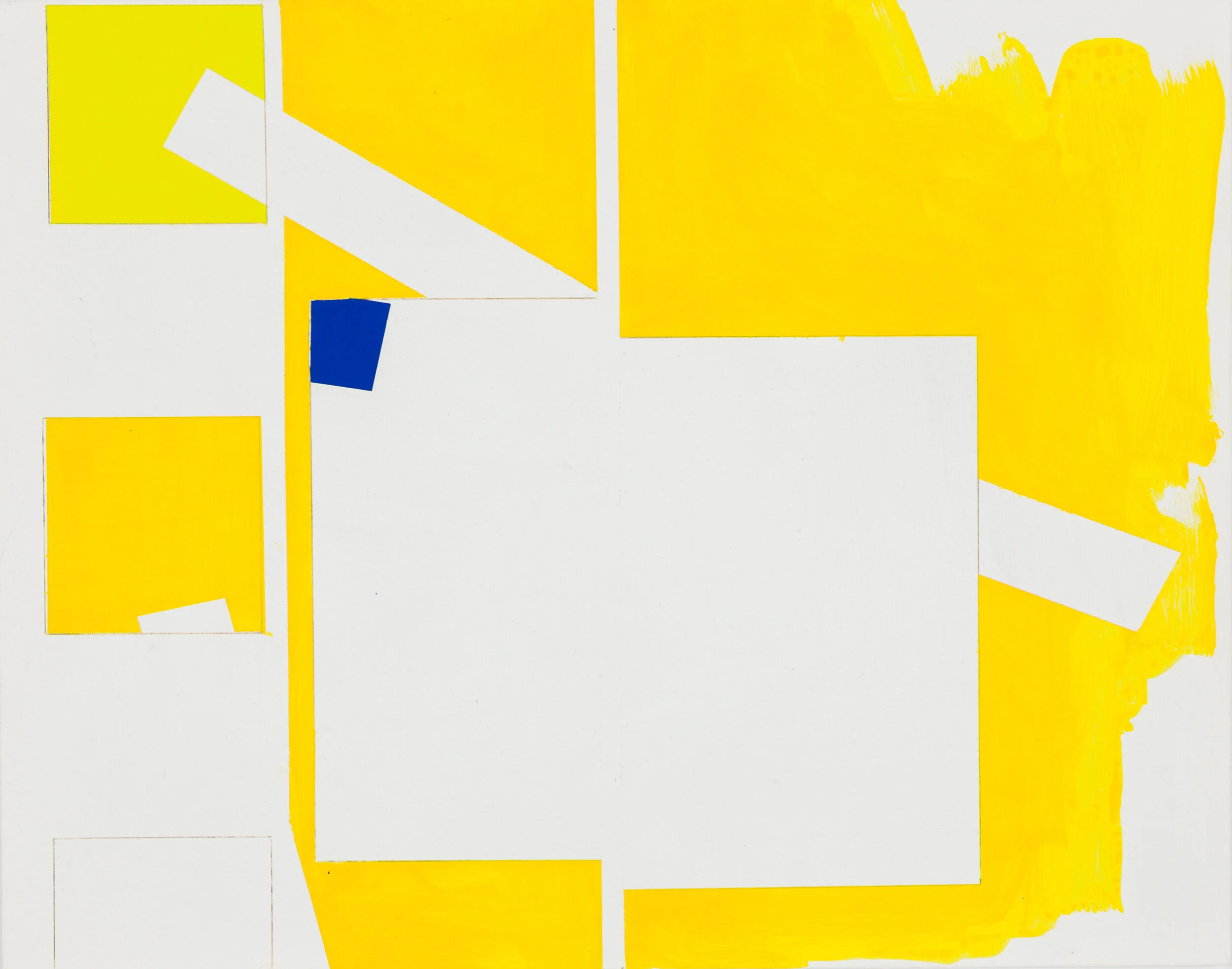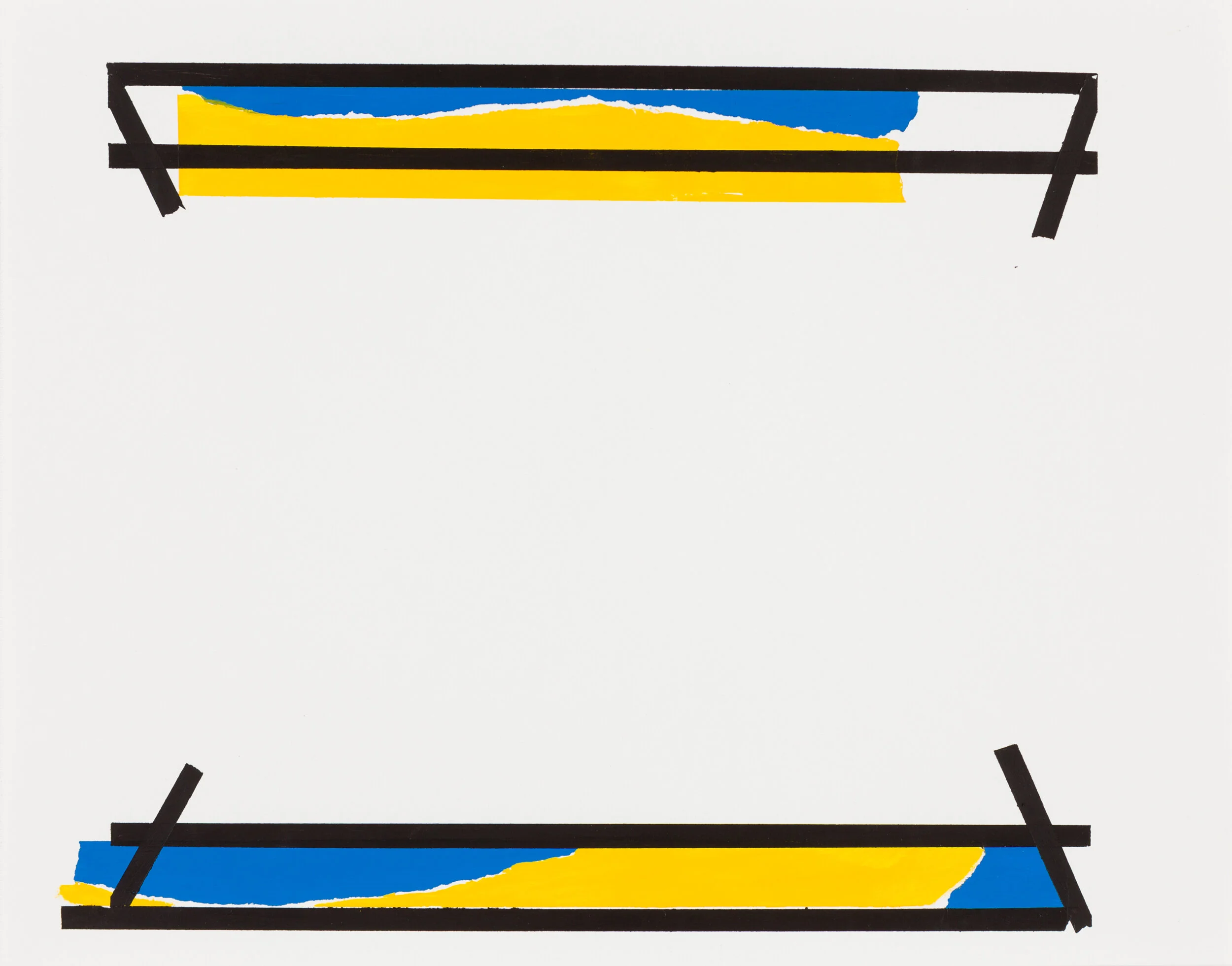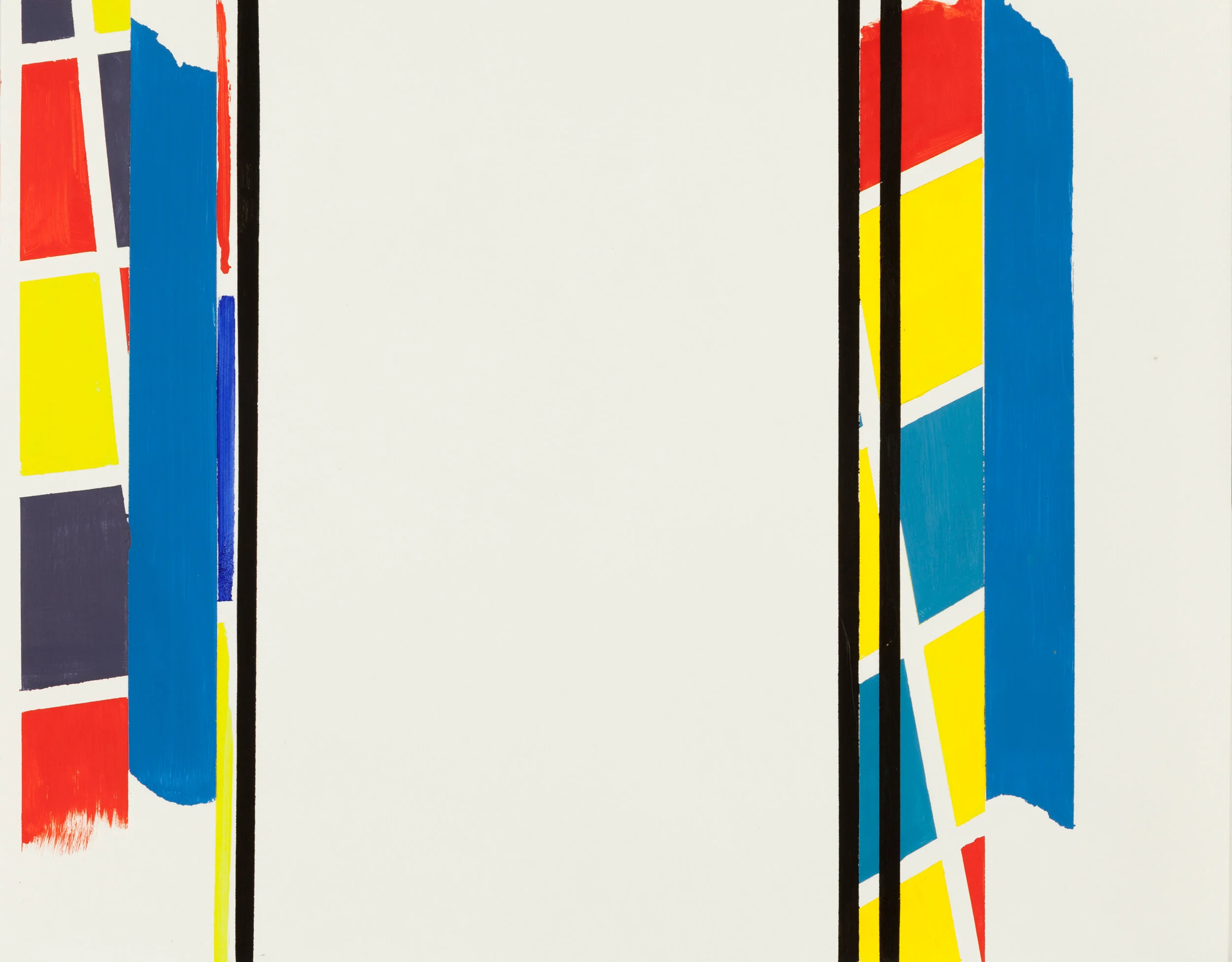 The frame is a complex topic, a term with palpable reference to contexts where interpretive potentiality proliferates. Here the frame articulates a shifting set of relative relations: what is built or painted above, upon, below; left or right of a center; within, without. As a figure, edge, or field of its own, line is constructed: simulated as tape through using acrylic to imitate masking tape on panels. The frame is also more: here it is a diagram of potential conceptual frames, mental structures.